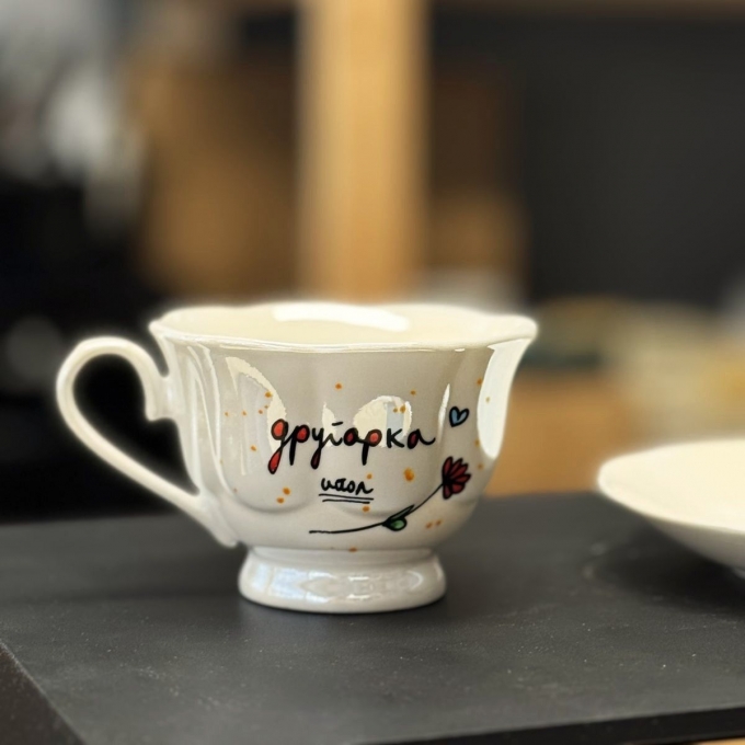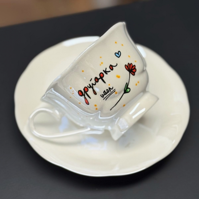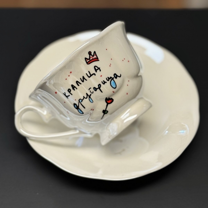 Шолја со тацна во боја на бисер која прелева и дизајниран натпис „Кралица другарица“ или „Другарка ипол“