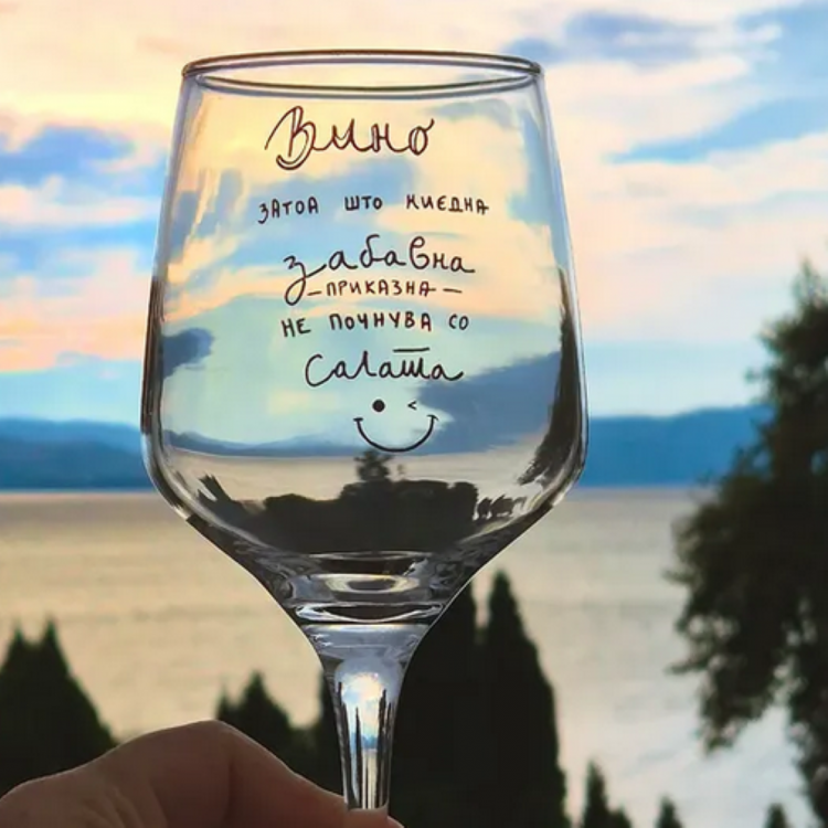 Чаша за вино со натпис Вино затоа што ниедна забавна приказна не почнува со салата