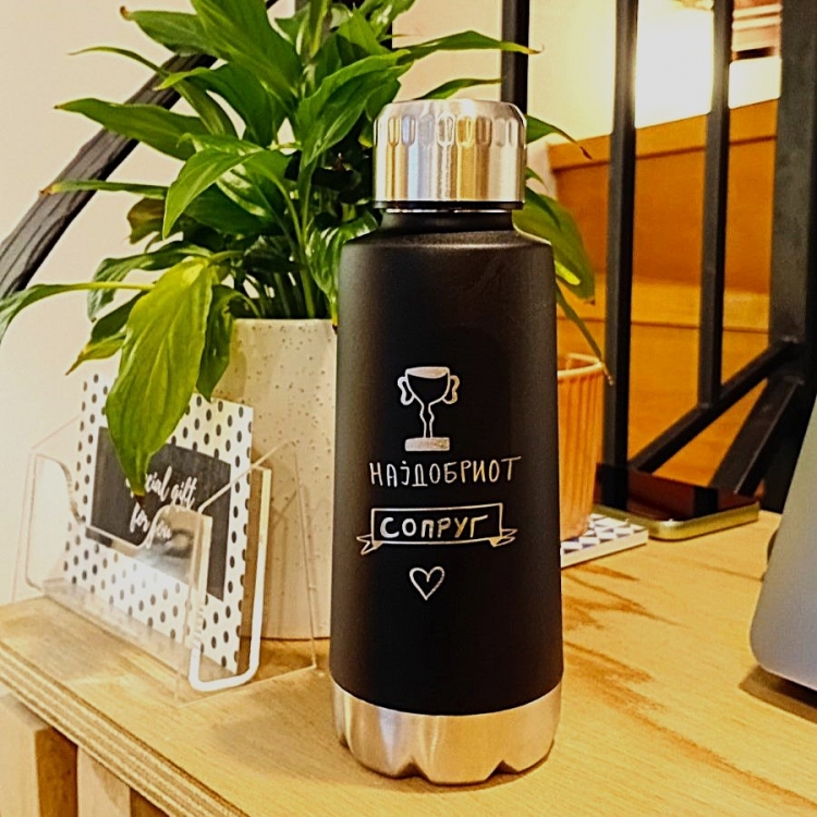 Елегантен модел, изработен од нерѓосувачки челик. Ова е новиот достапен термос со траен гравиран дизајн.