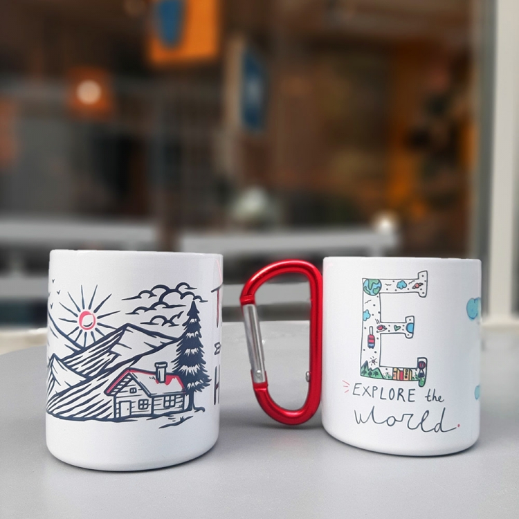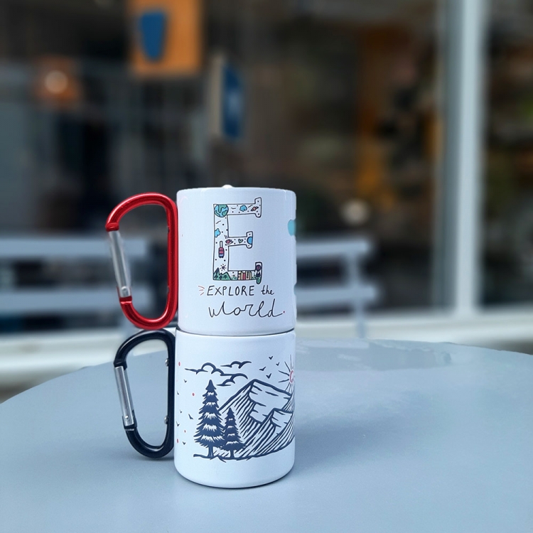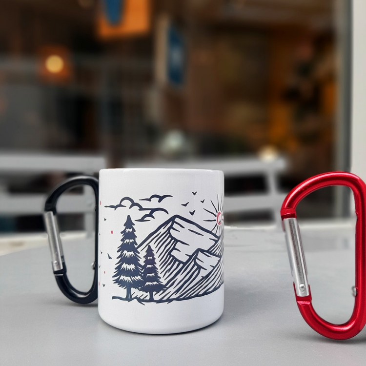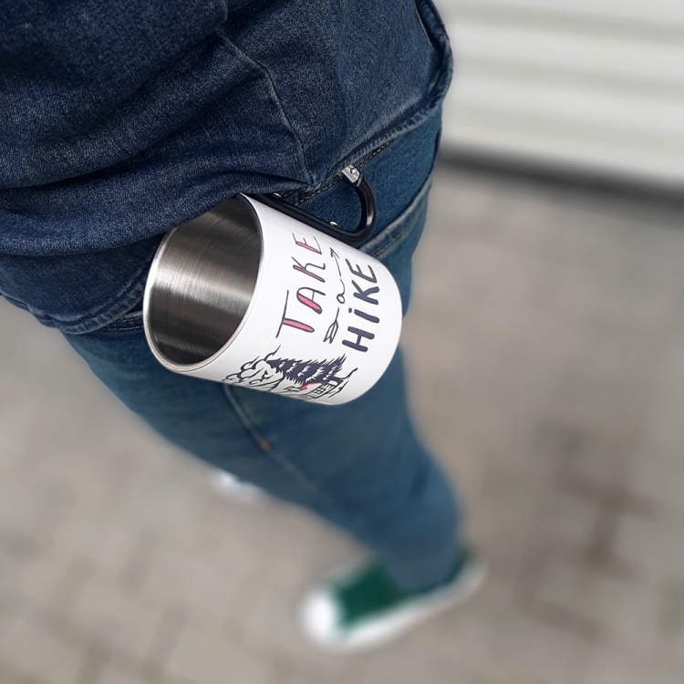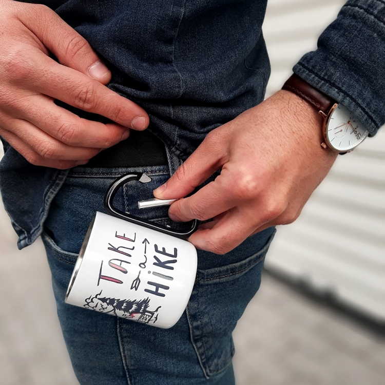 Hike метална шолја со рачка која што може да се закачува (боја по избор црна или црвена рачка) со дизајн "Take a hike"