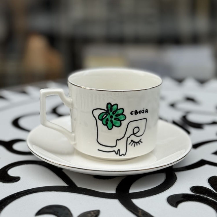 Шолја со тацна нацртана во стилот One line СВОЈА