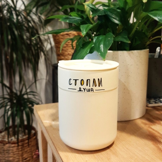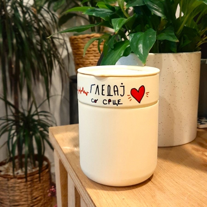 Керамичка термос чашка со капак и силиконска заштитна обвивка:
