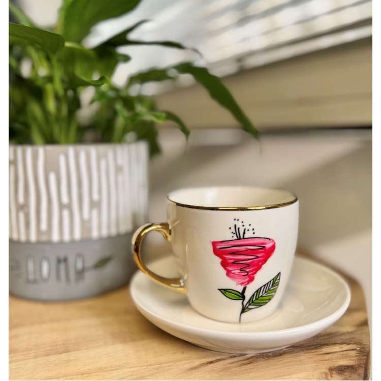 Уживајте во кафето на посебен начин! Елегантна шолја за кафе со рачно цртан цветен дизајн