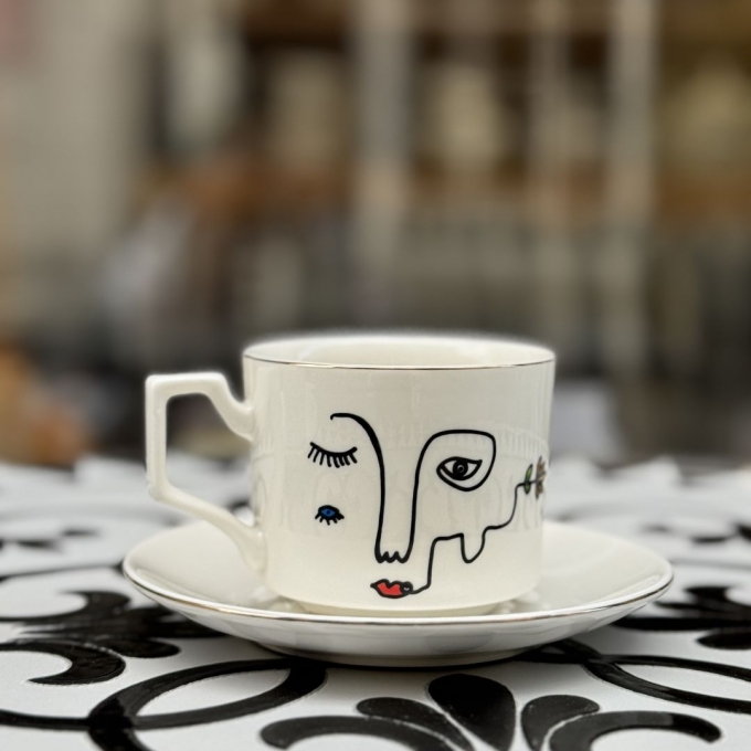 Шолја со тацна нацртана во стилот One line ДЕВОЈКА