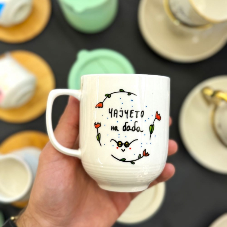 Порцеланска шолја со кириличен натпис за баба и нејзиното топло чајче <3