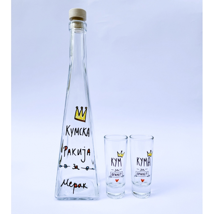 Сет шише "Кумска ракија за мерак" и 2 чаши за ракија со натписи