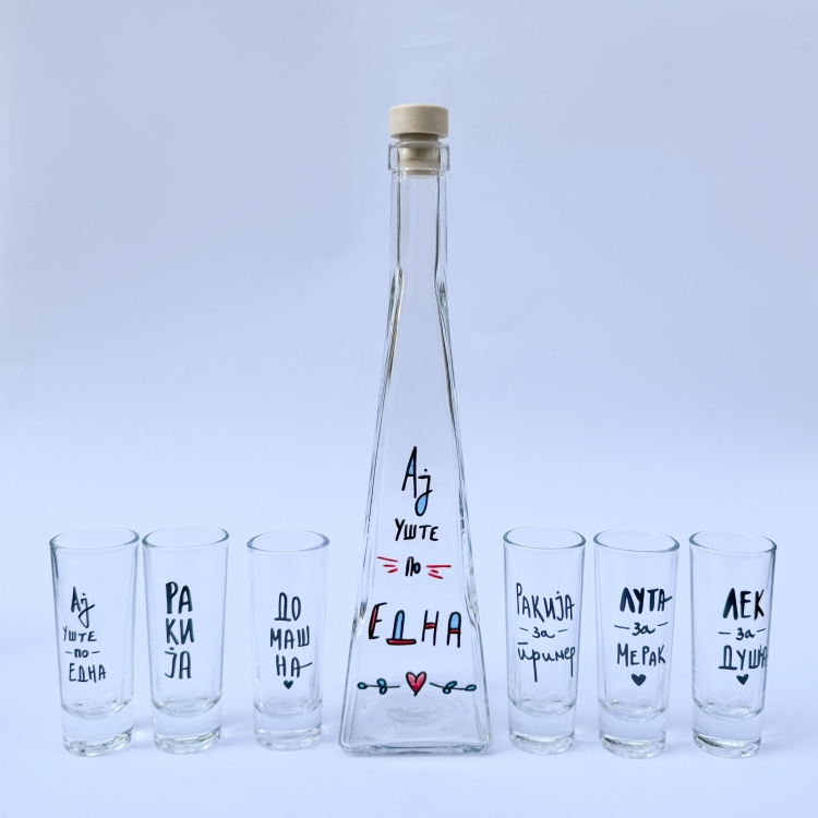 Сет шише "Aj уште по една" и 6 чаши за ракија